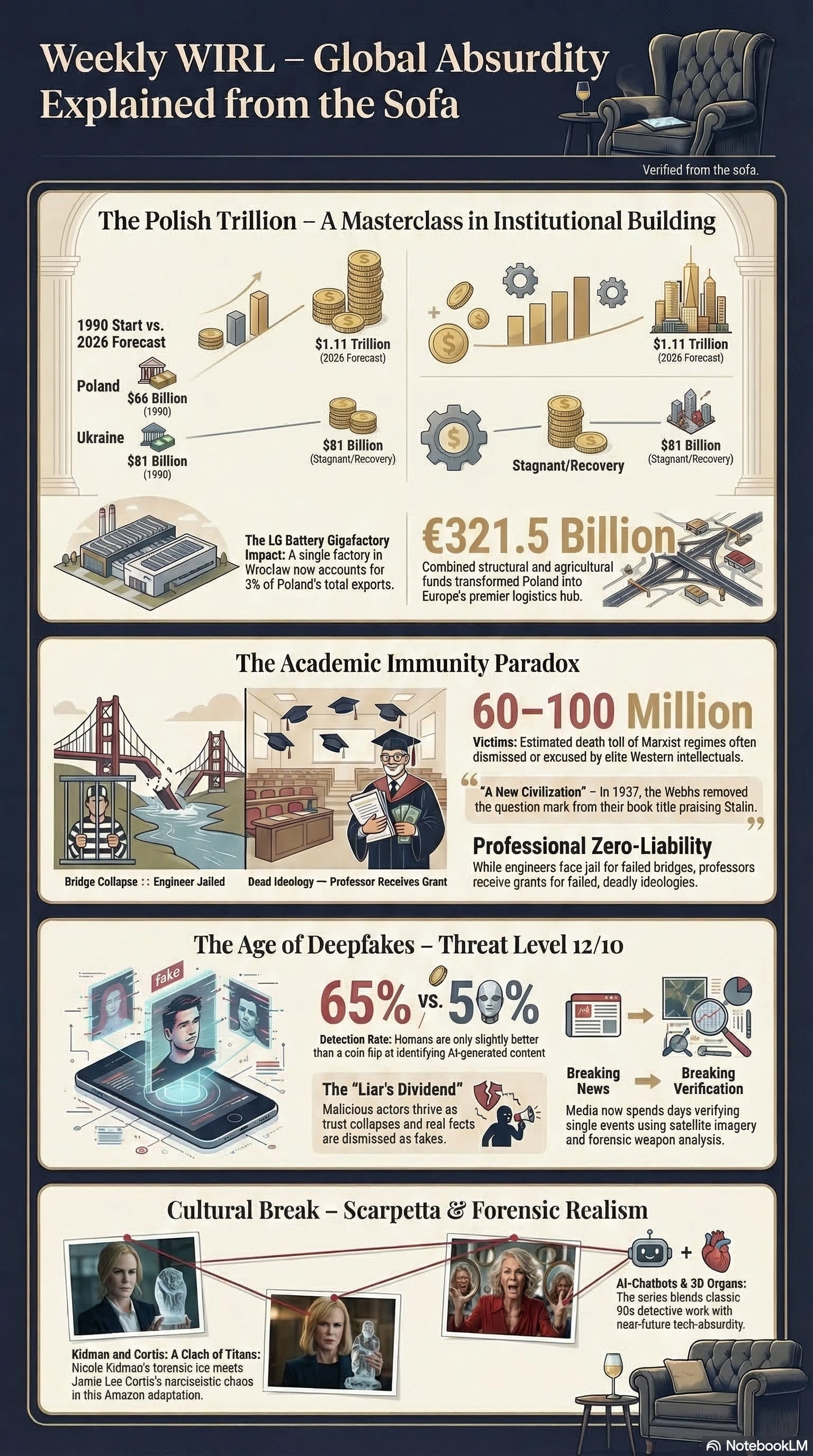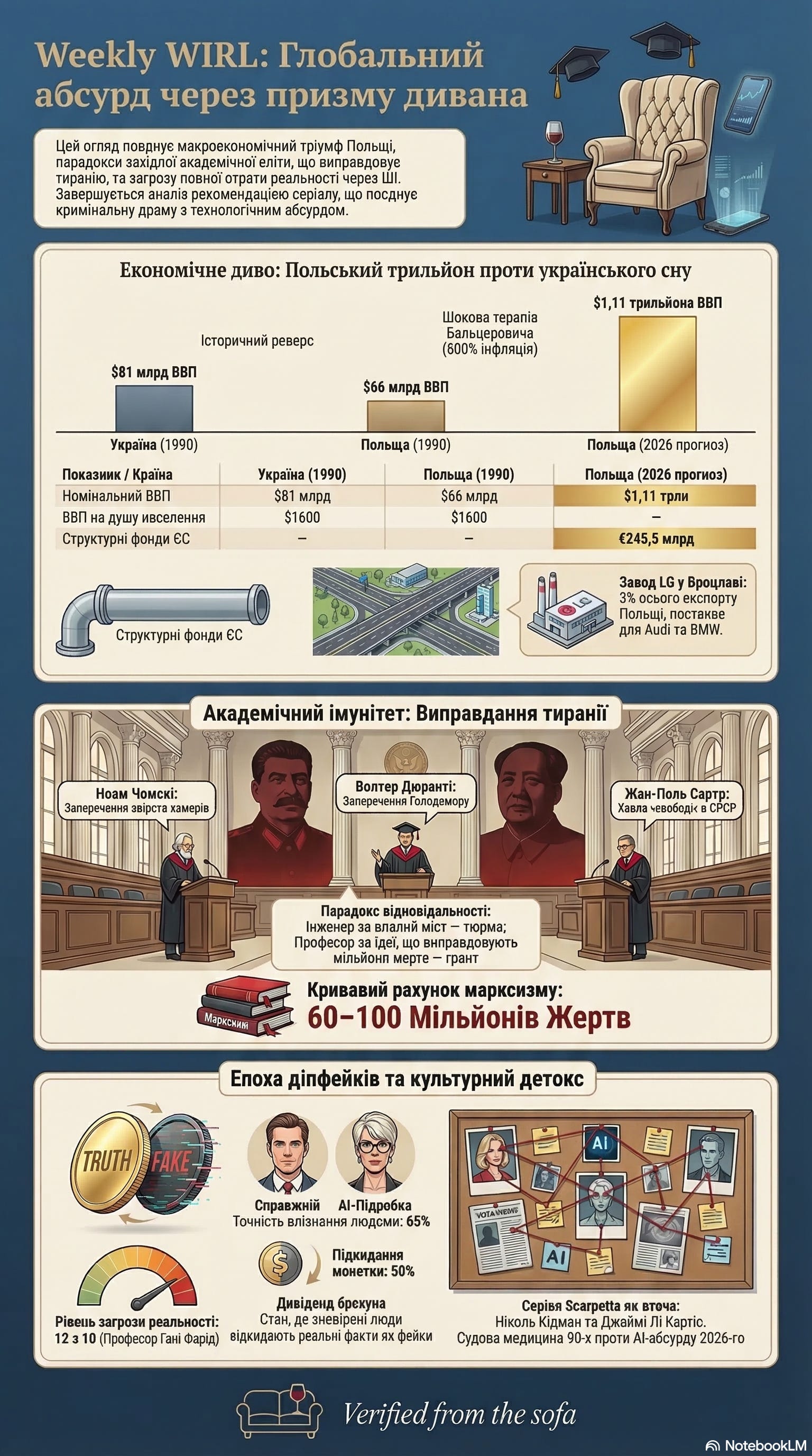 Ваш улюблений диванний експерт знову на базі. Сиджу я, значить, з келихом білого вина, гортаю стрічку і розумію одну річ: як добре, що мій диван такий важкий і стійкий. Бо світ цього тижня хитає так, ніби він вирішив одночасно скасувати реальність, математику та історичну пам’ять. Цього тижня ми побачимо, як економіка, академічна еліта та технології змовилися, щоб остаточно звести нас з розуму.