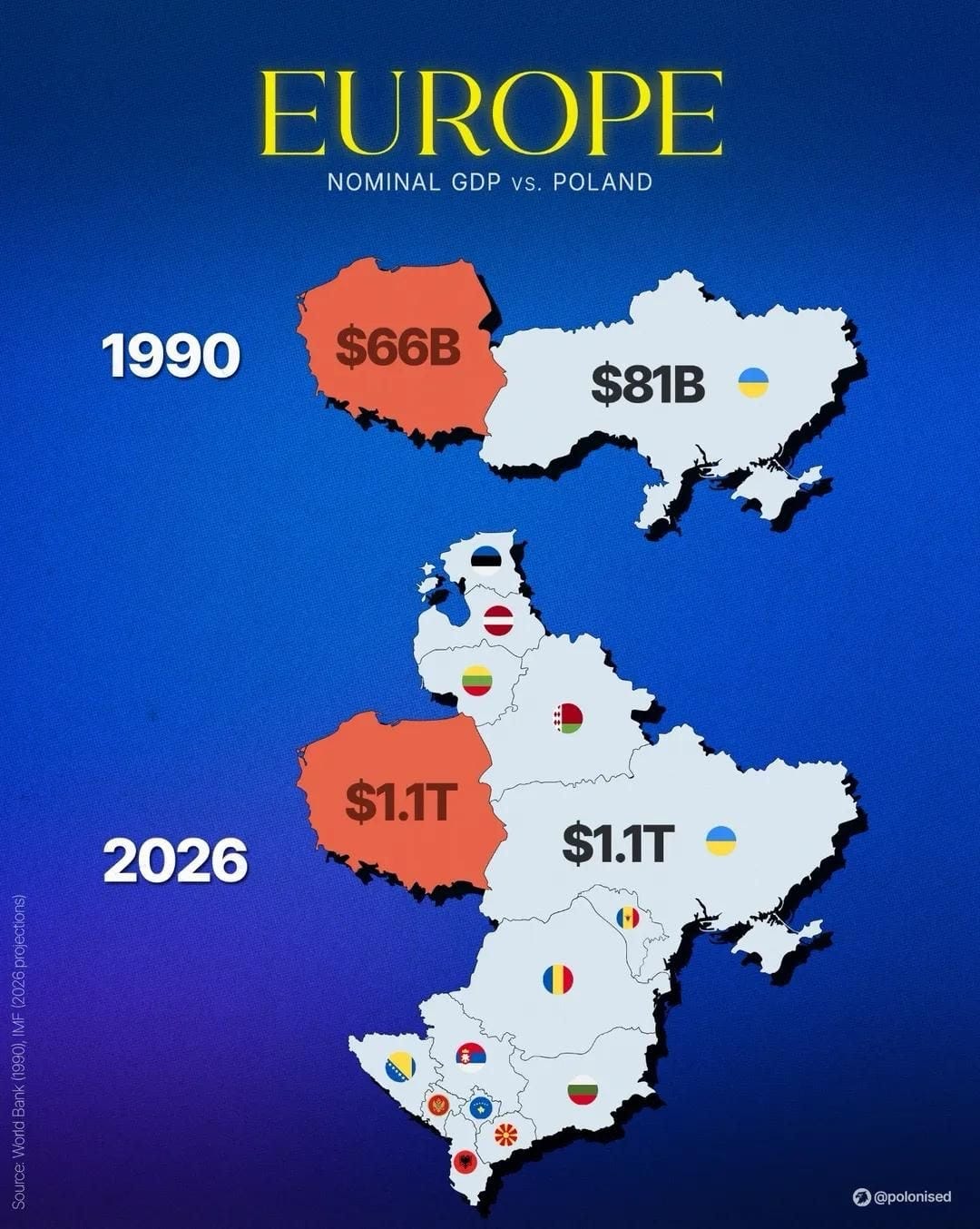 Чем нам известен 1990 год? Конечно тем, что Советский Союз рассыпается. И в это время Украина с Польшей находятся на абсолютно одинаковой стартовой линии. Номинальный ВВП Польши составлял скромные 66 миллиардов долларов, а наш даже превышал эту цифру – целых 81 миллиард. На душу населения мы имели одинаковые 1600 баксов и глубокий кризис. Всё, на этом историческую справку о нашем старте закрываем и дальше смотрим исключительно на запад. Потому что то, что произошло там дальше – это просто эталонный мастер-класс по построению государства, который стоит преподавать в университетах.
