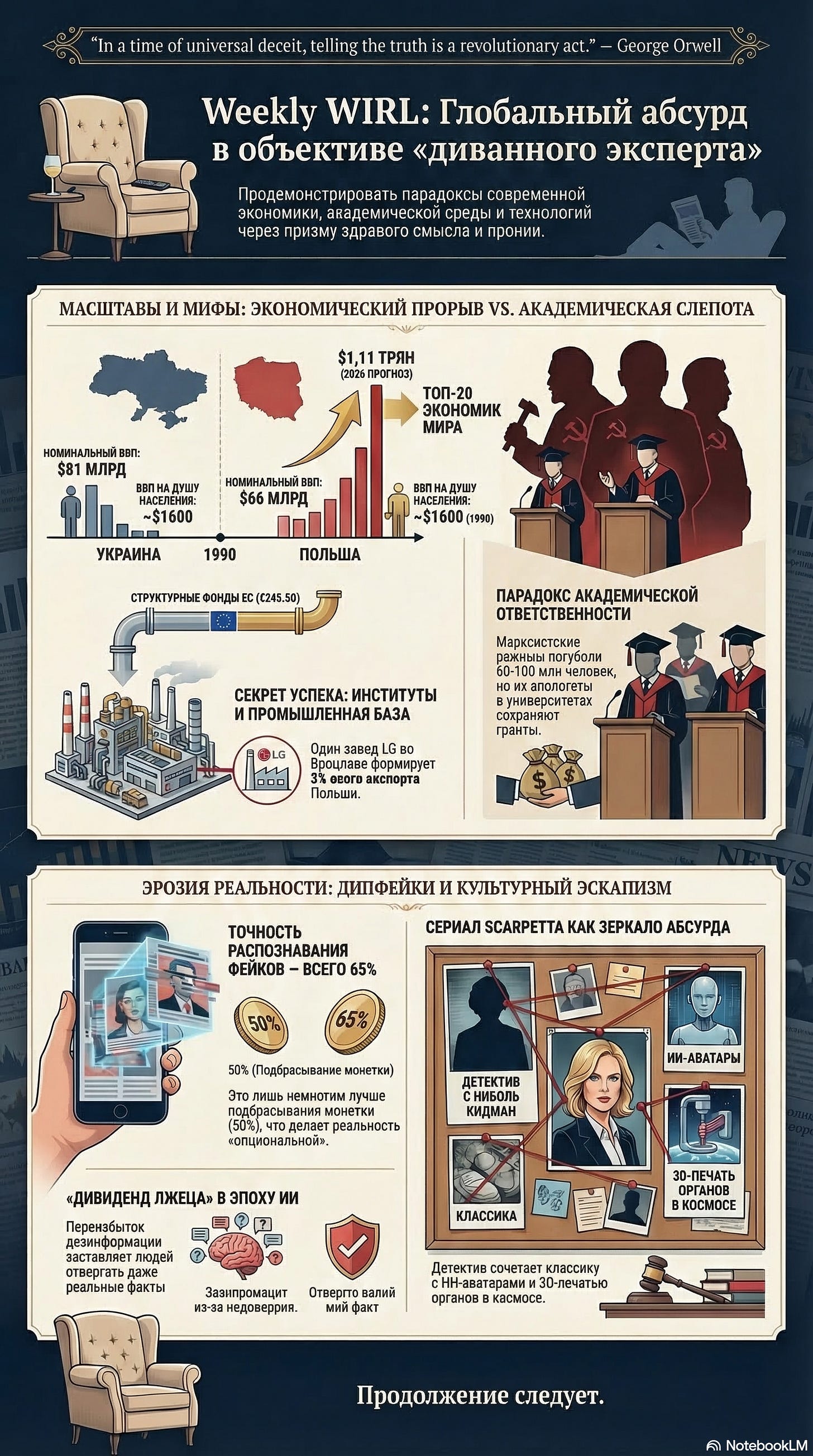 Ваш любимый диванный эксперт снова на базе. Сижу я, значит, с бокалом белого вина, листаю ленту и понимаю одну вещь: как хорошо, что мой диван такой тяжёлый и устойчивый. Потому что мир на этой неделе шатает так, будто он решил одновременно отменить реальность, математику и историческую память. На этой неделе мы увидим, как экономика, академическая элита и технологии сговорились, чтобы окончательно свести нас с ума.